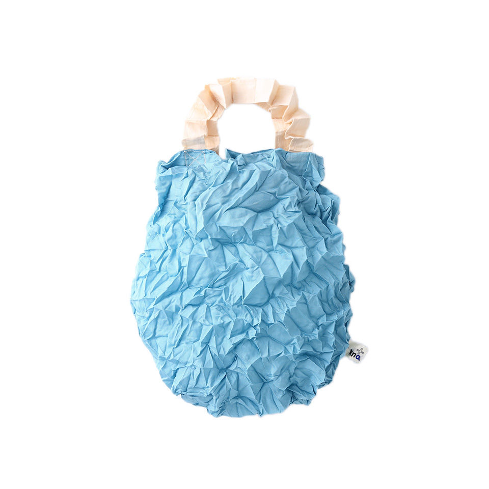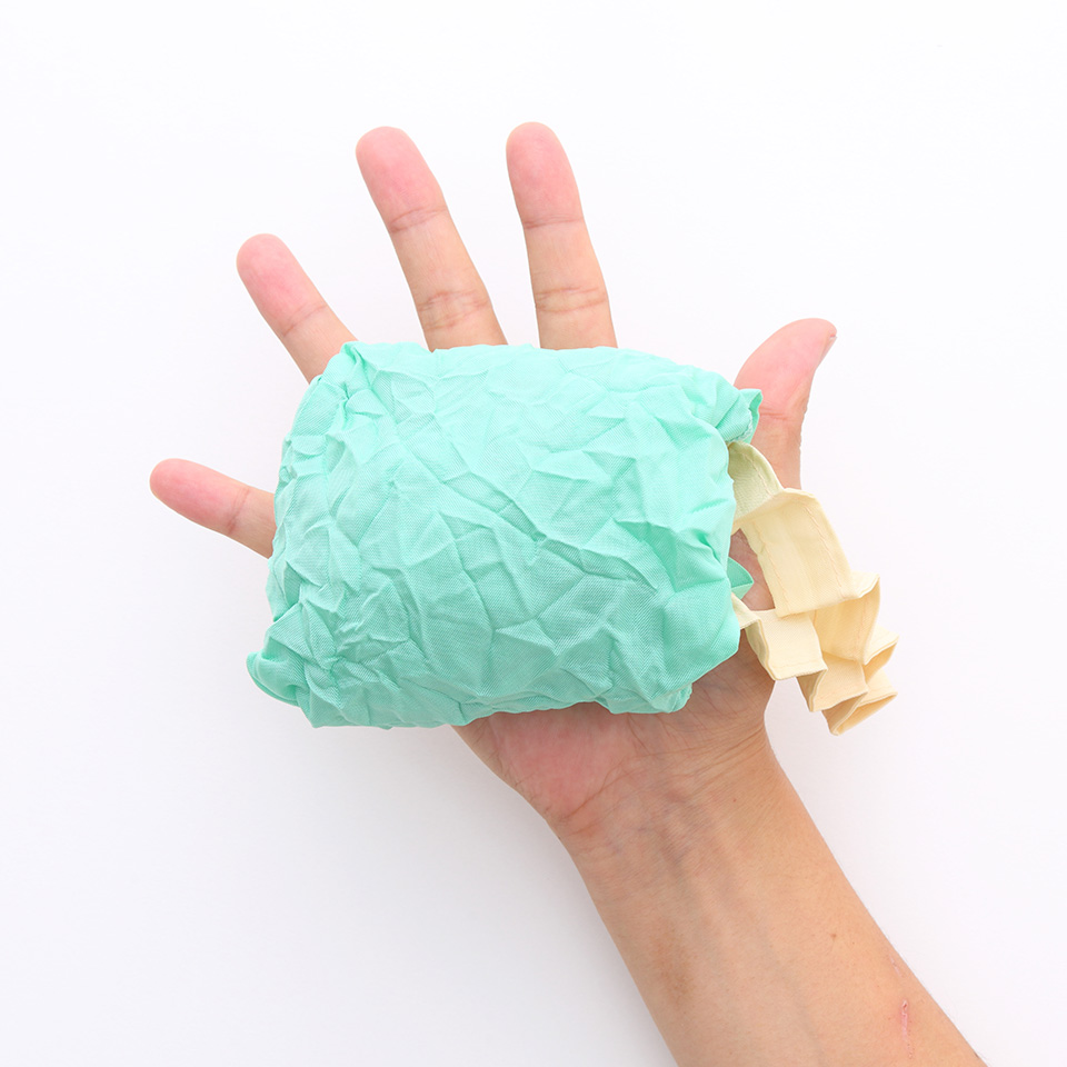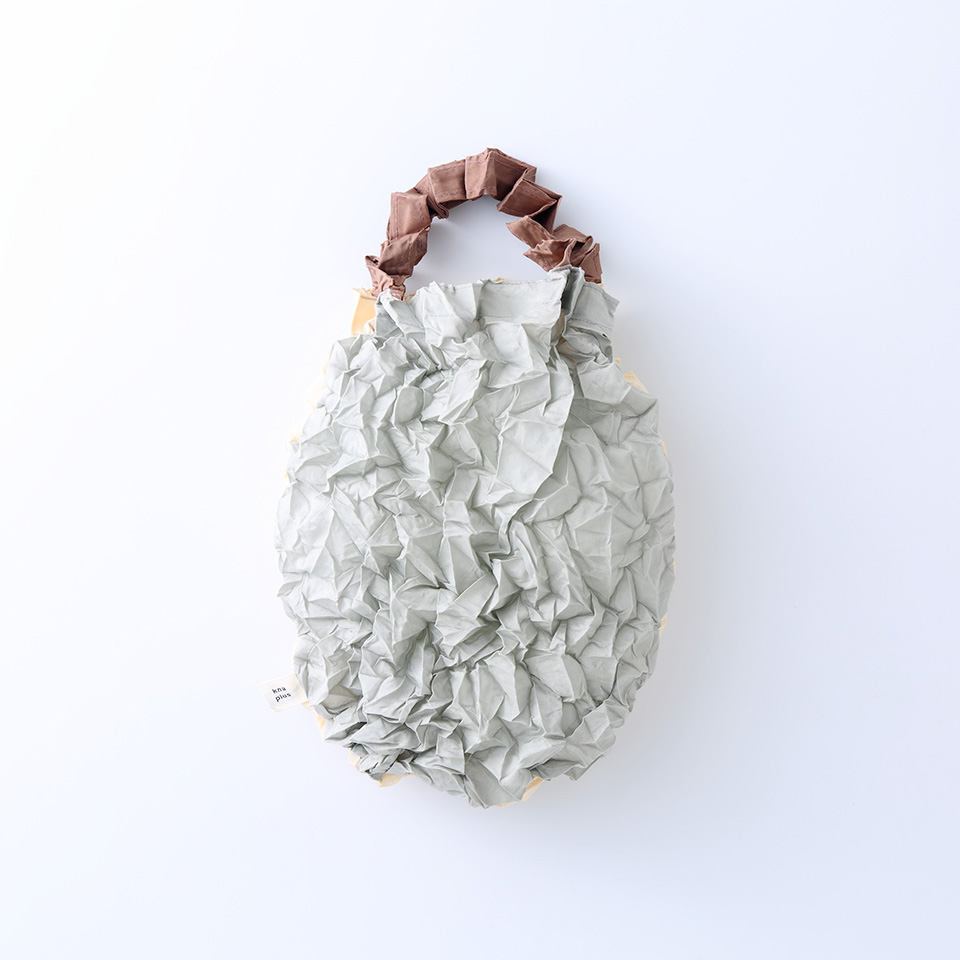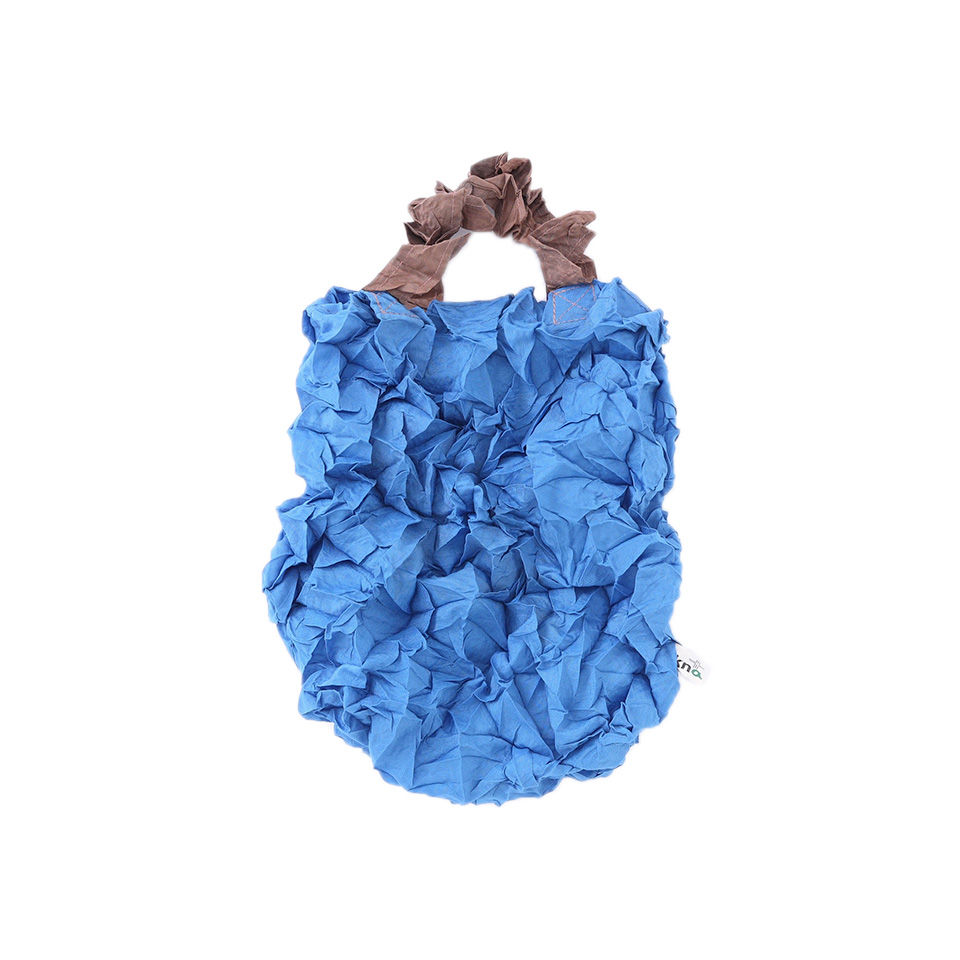 Over-the-shoulder/hand carry tote with an inside pocket. By extending the crumpled fabrics ,the same amount of 2L bottles, as well as A4 sized files can be contained. Scrunch it up and put in the inside pocket for keeping it compact. It withstands the weight up to 10kg but it may tear by adding sudden force such as lifting it at a stretch.