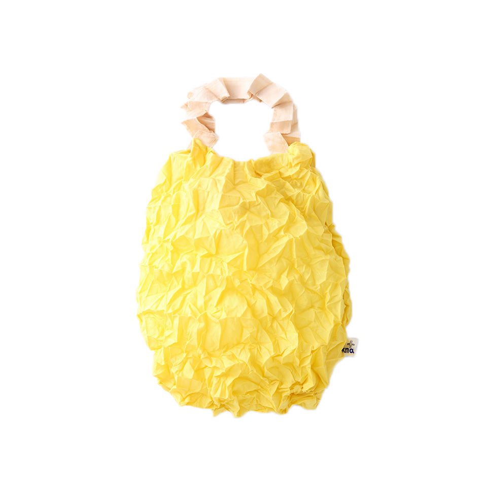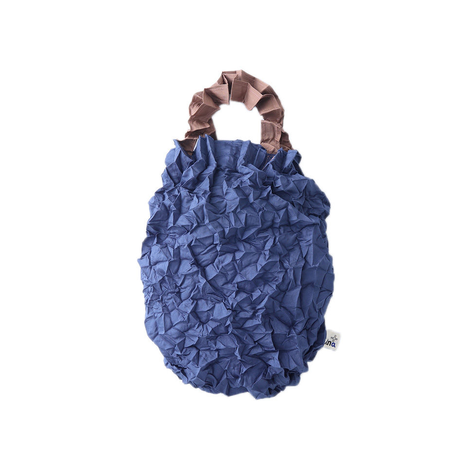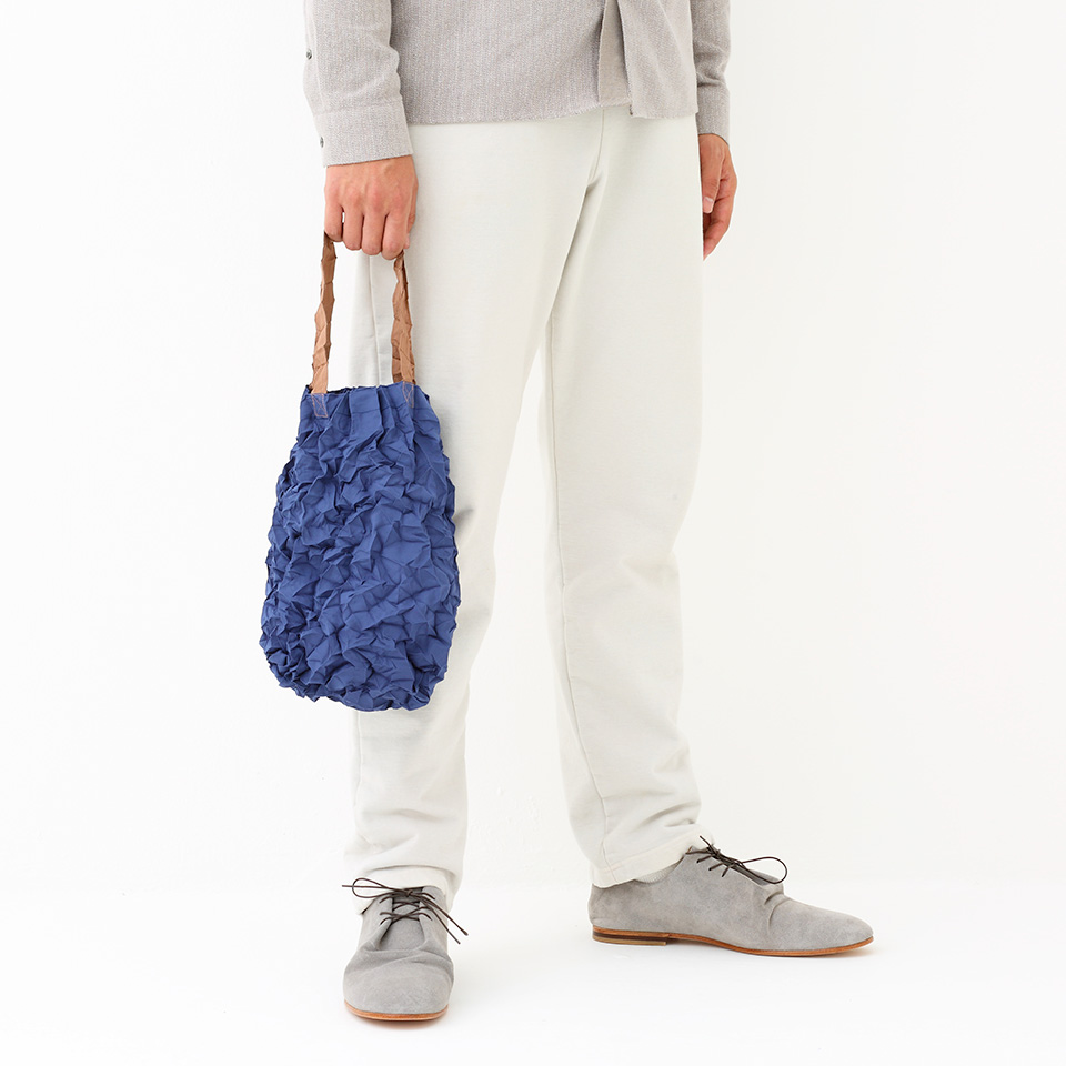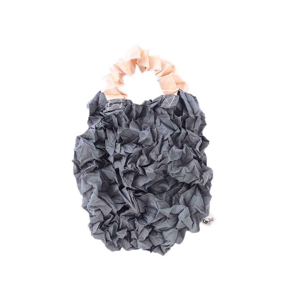 Over-the-shoulder/hand carry tote with an inside pocket. By extending the crumpled fabrics ,the same amount of 2L bottles, as well as A4 sized files can be contained. Scrunch it up and put in the inside pocket for keeping it compact. It withstands the weight up to 10kg but it may tear by adding sudden force such as lifting it at a stretch.
